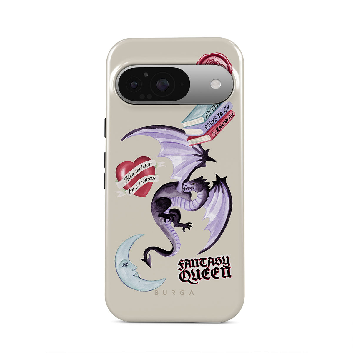 Este design contém: dragão roxo, adesivo "Rainha da Fantasia", lua crescente, lacre de cera roxa, coração com mensagem, livros.