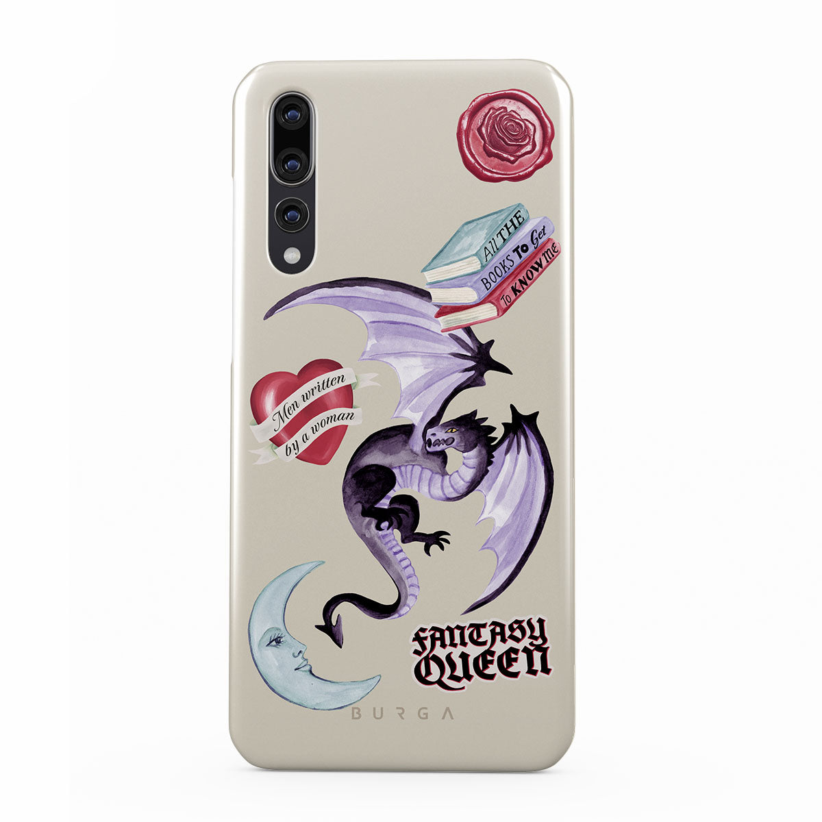 Este design contém: dragão roxo, adesivo "Rainha da Fantasia", lua crescente, lacre de cera roxa, coração com mensagem, livros.
