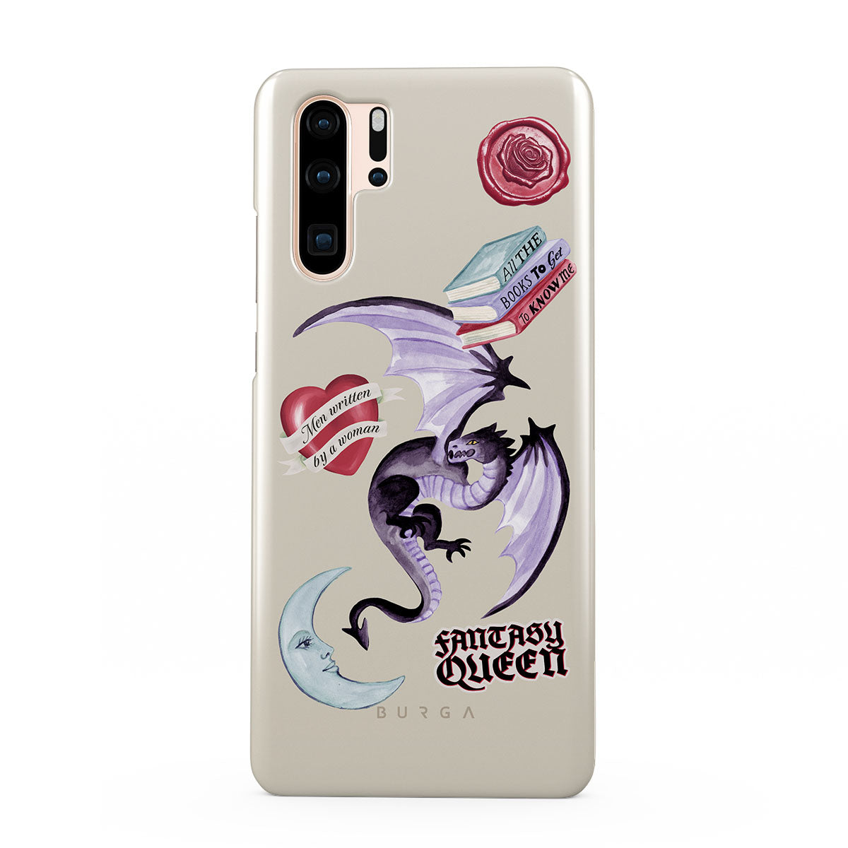 Este design contém: dragão roxo, adesivo "Rainha da Fantasia", lua crescente, lacre de cera roxa, coração com mensagem, livros.
