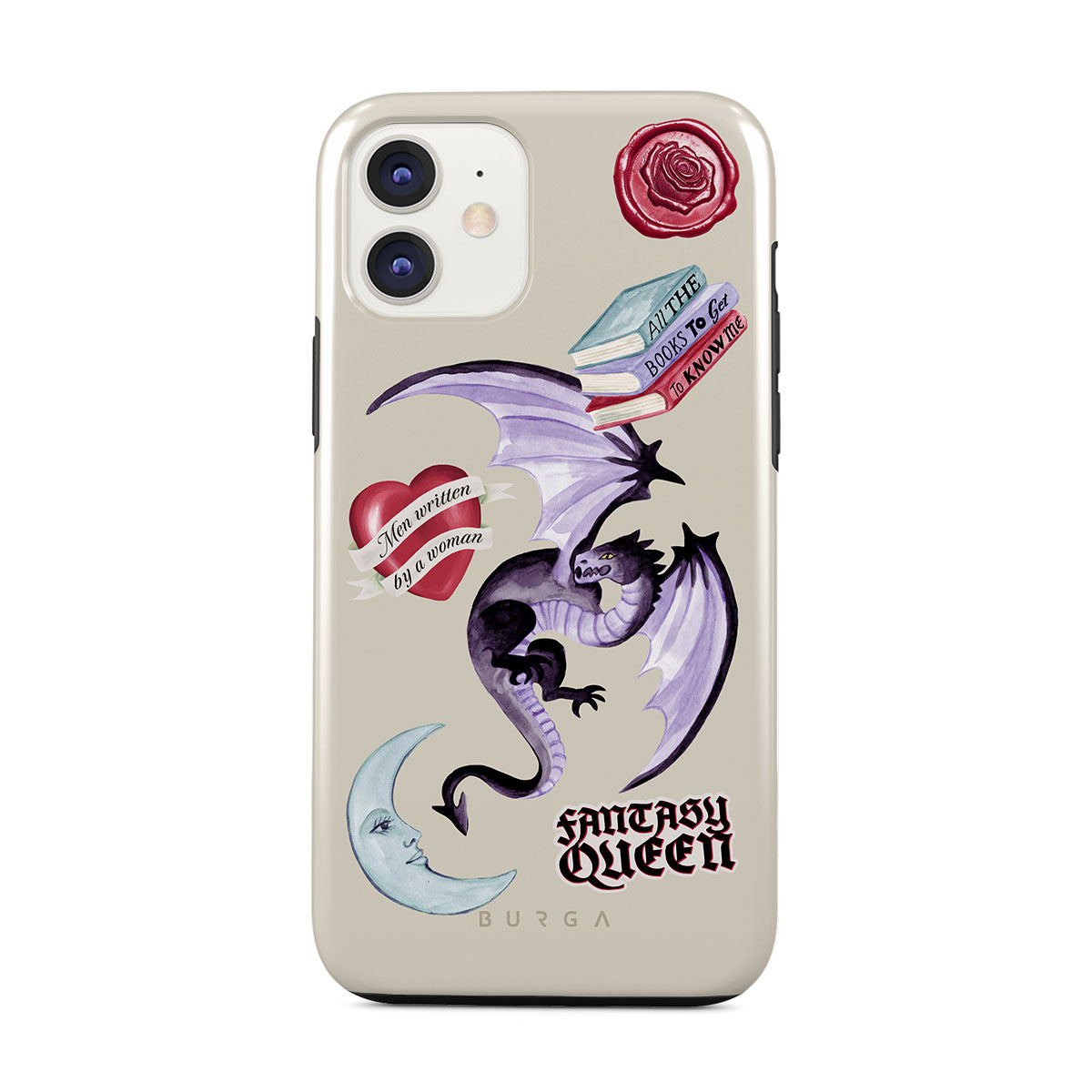 Este design contém: dragão roxo, adesivo "Rainha da Fantasia", lua crescente, lacre de cera roxa, coração com mensagem, livros.