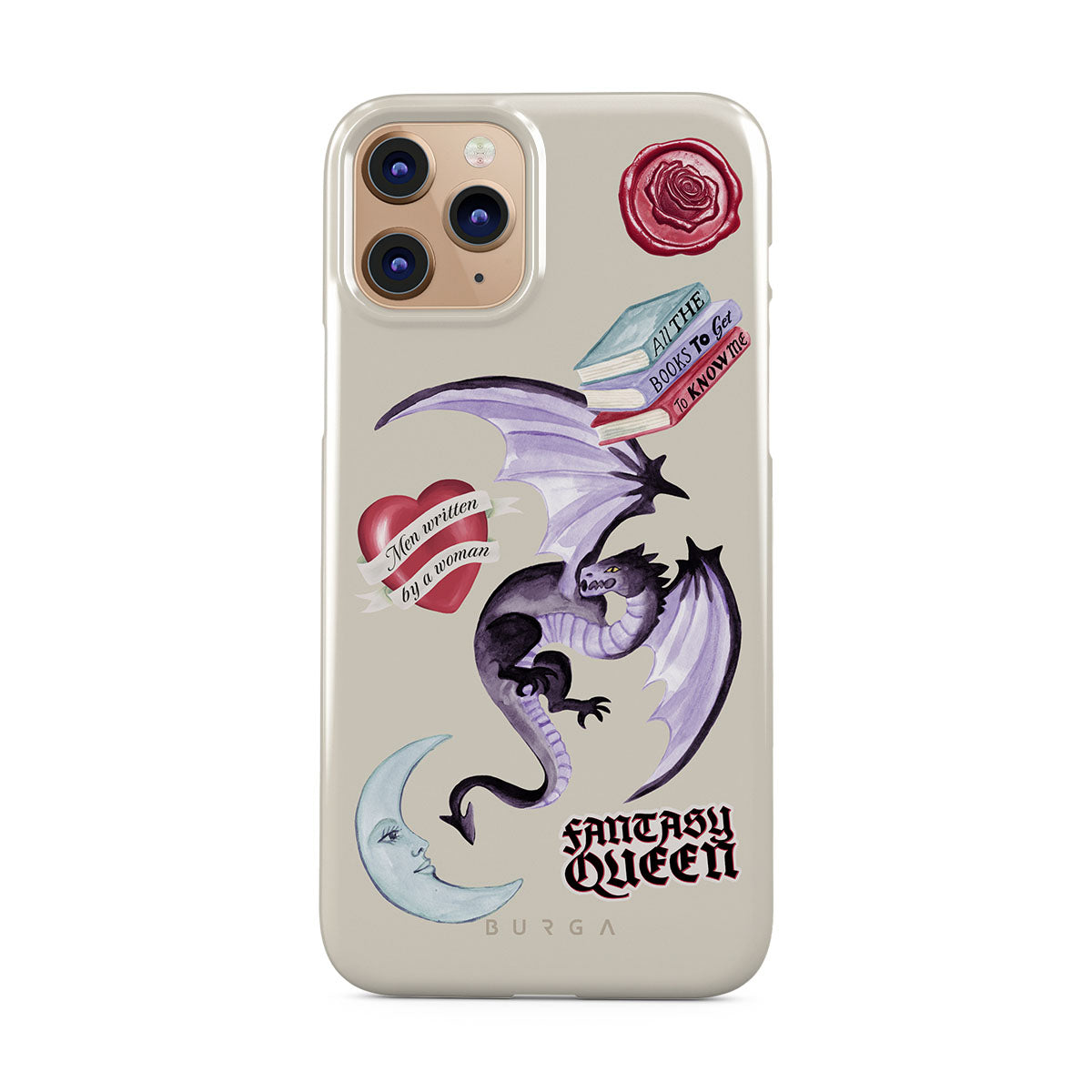 Este design contém: dragão roxo, adesivo "Rainha da Fantasia", lua crescente, lacre de cera roxa, coração com mensagem, livros.