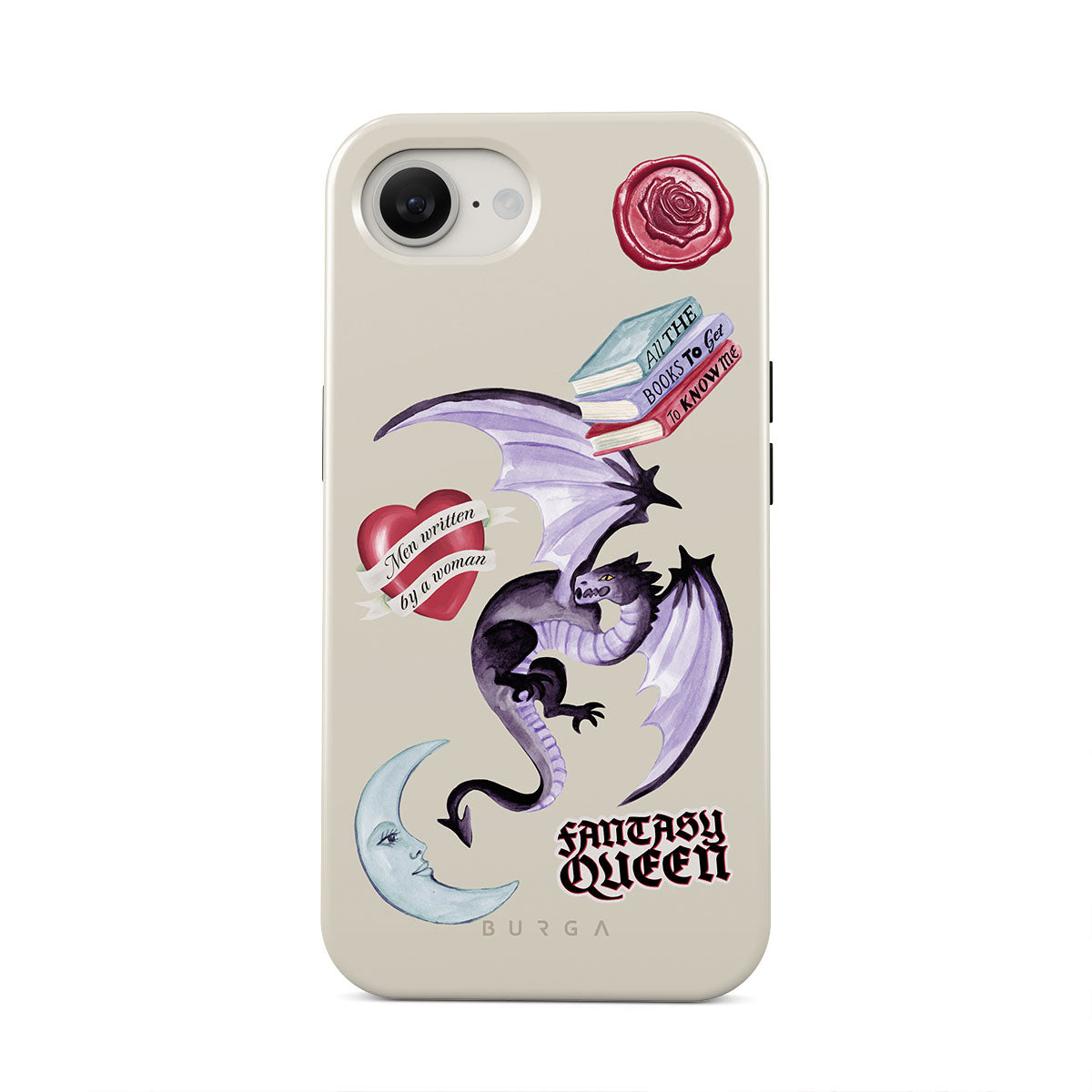 Este design contém: dragão roxo, adesivo "Rainha da Fantasia", lua crescente, lacre de cera roxa, coração com mensagem, livros.