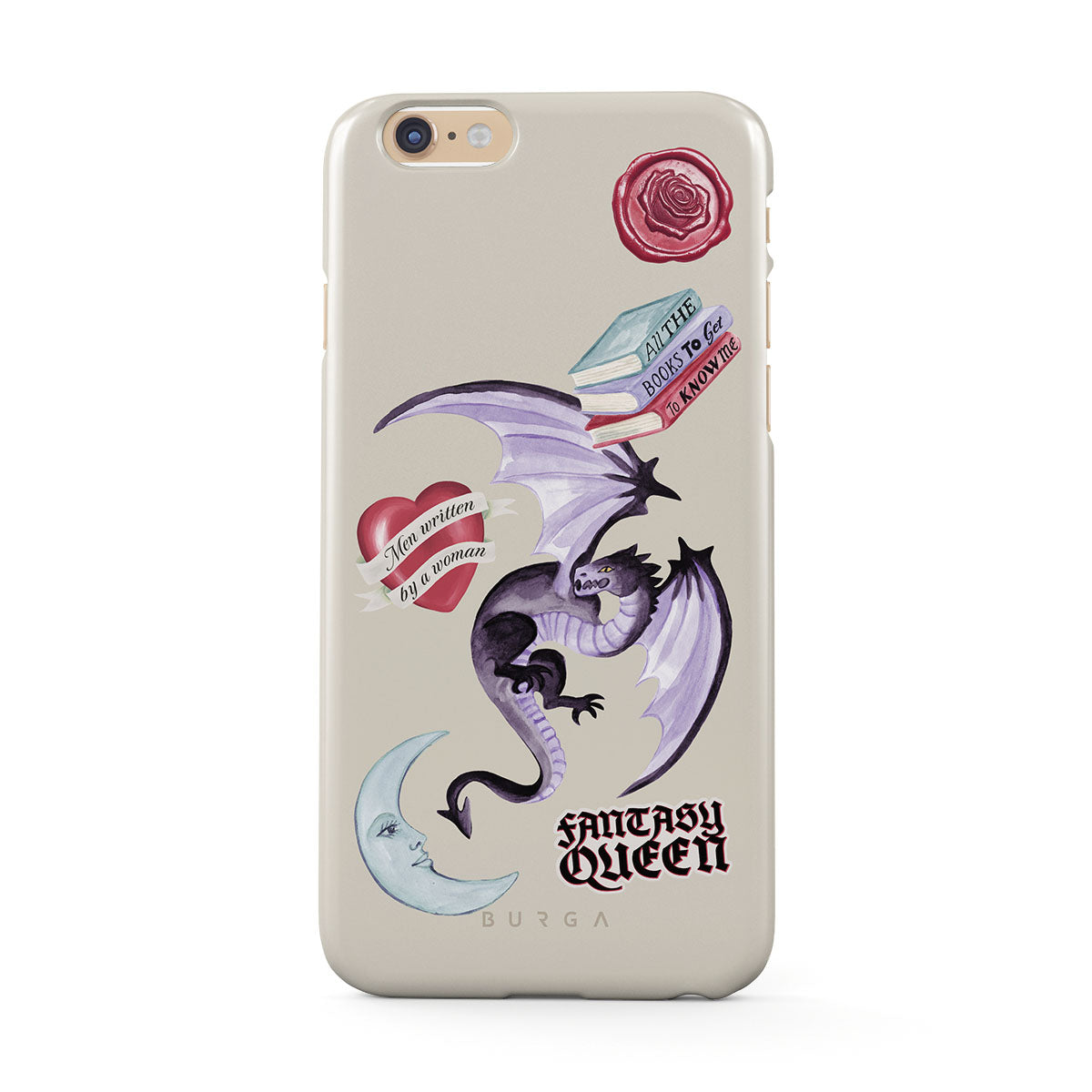 Este design contém: dragão roxo, adesivo "Rainha da Fantasia", lua crescente, lacre de cera roxa, coração com mensagem, livros.