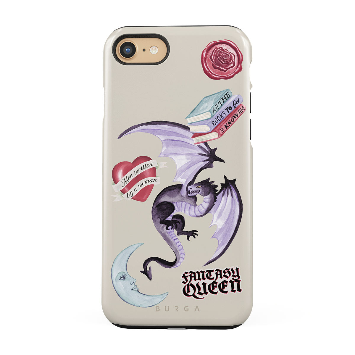 Este design contém: dragão roxo, adesivo "Rainha da Fantasia", lua crescente, lacre de cera roxa, coração com mensagem, livros.