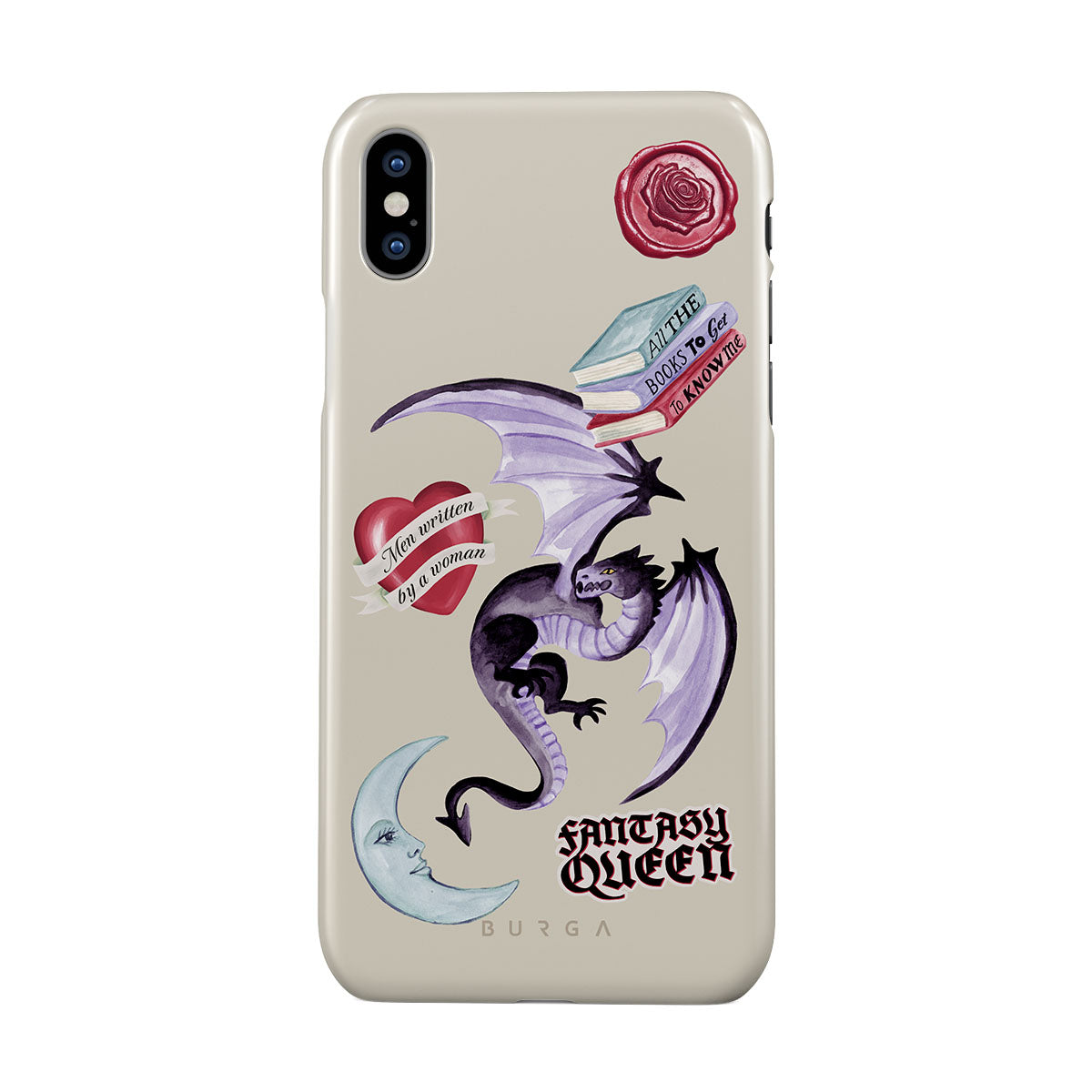 Este design contém: dragão roxo, adesivo "Rainha da Fantasia", lua crescente, lacre de cera roxa, coração com mensagem, livros.