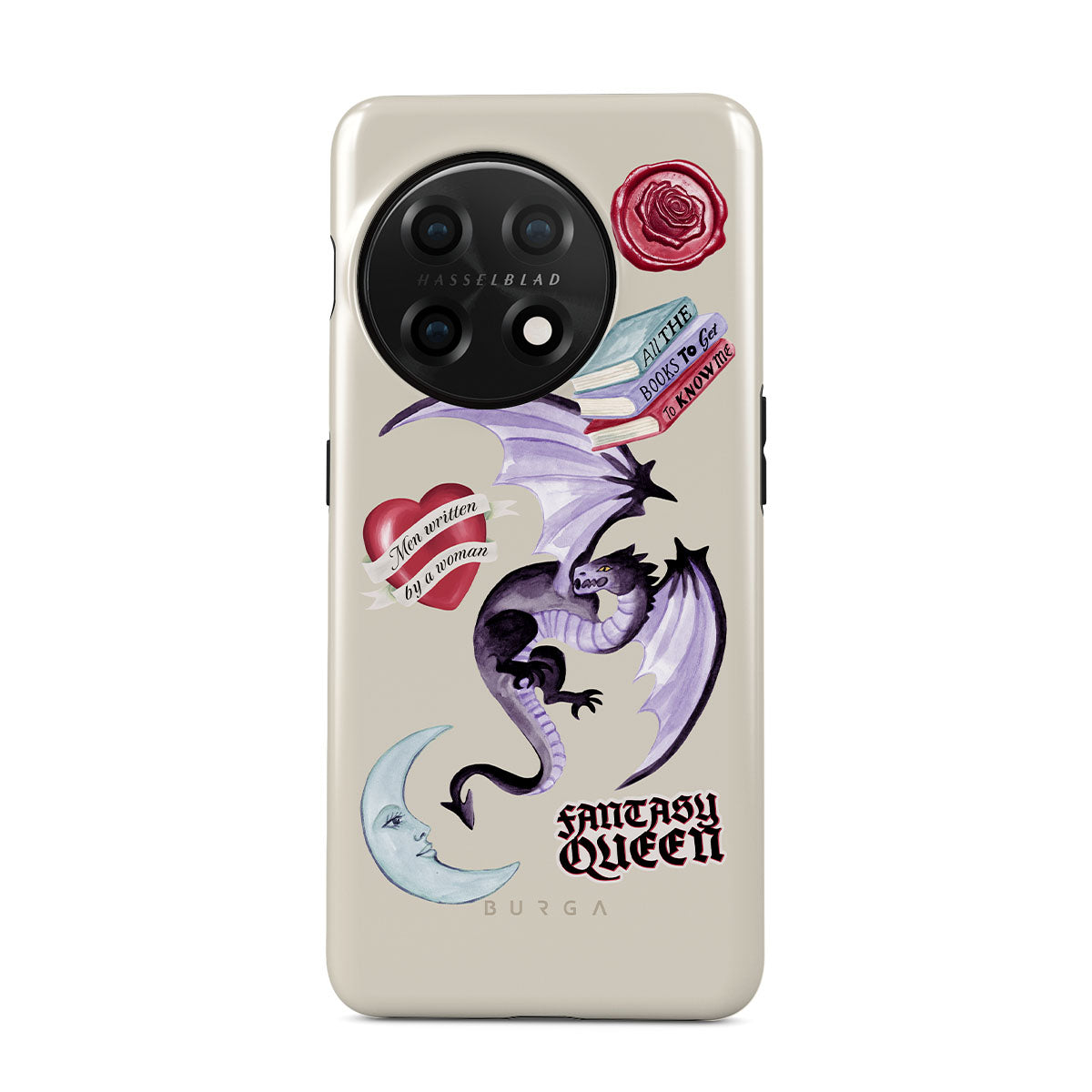 Este design contém: dragão roxo, adesivo "Rainha da Fantasia", lua crescente, lacre de cera roxa, coração com mensagem, livros.
