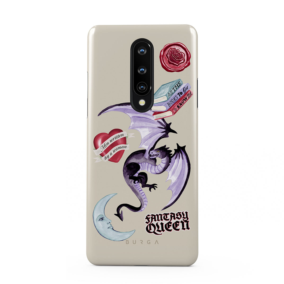 Este design contém: dragão roxo, adesivo "Rainha da Fantasia", lua crescente, lacre de cera roxa, coração com mensagem, livros.