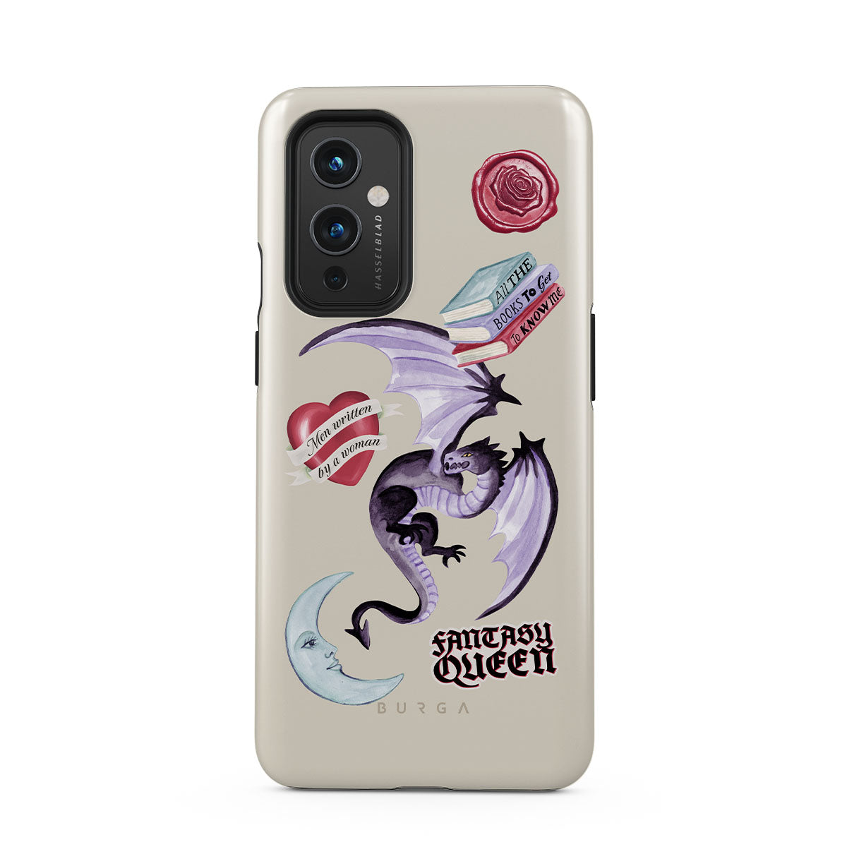 Este design contém: dragão roxo, adesivo "Rainha da Fantasia", lua crescente, lacre de cera roxa, coração com mensagem, livros.