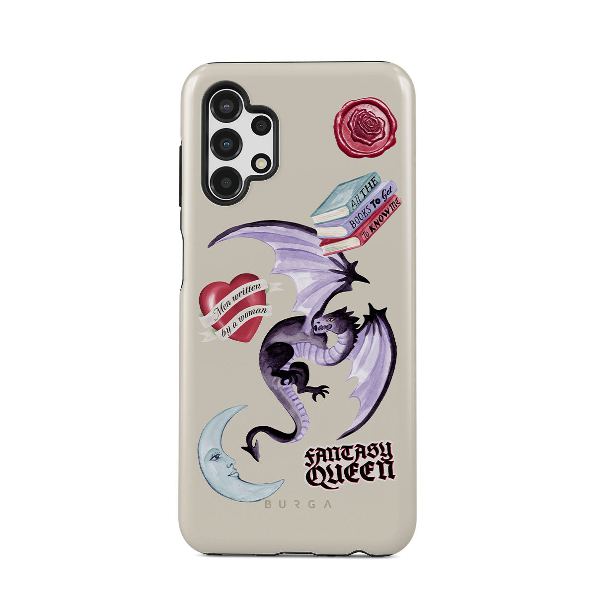 Este design contém: dragão roxo, adesivo "Rainha da Fantasia", lua crescente, lacre de cera roxa, coração com mensagem, livros.