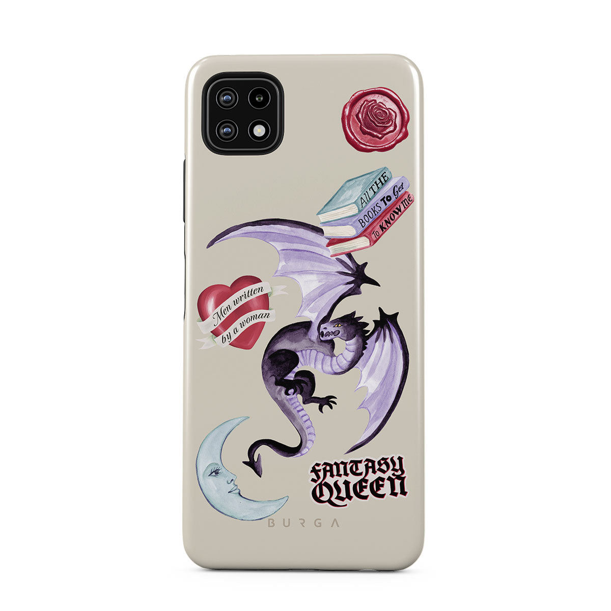 Este design contém: dragão roxo, adesivo "Rainha da Fantasia", lua crescente, lacre de cera roxa, coração com mensagem, livros.
