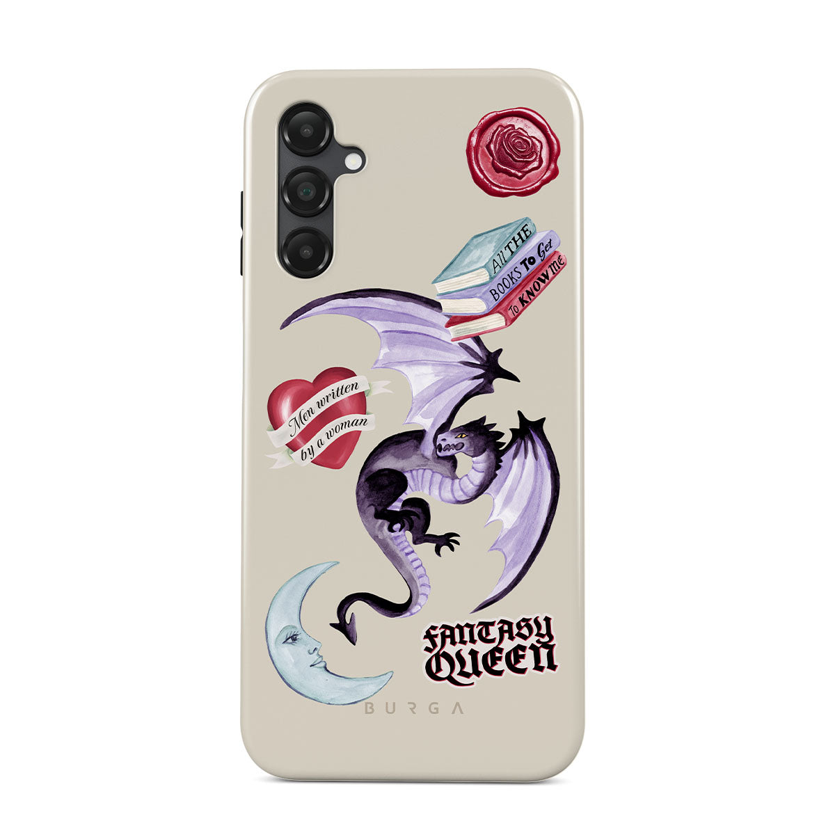 Este design contém: dragão roxo, adesivo "Rainha da Fantasia", lua crescente, lacre de cera roxa, coração com mensagem, livros.