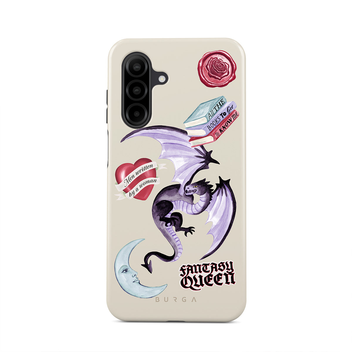 Este design contém: dragão roxo, adesivo "Rainha da Fantasia", lua crescente, lacre de cera roxa, coração com mensagem, livros.