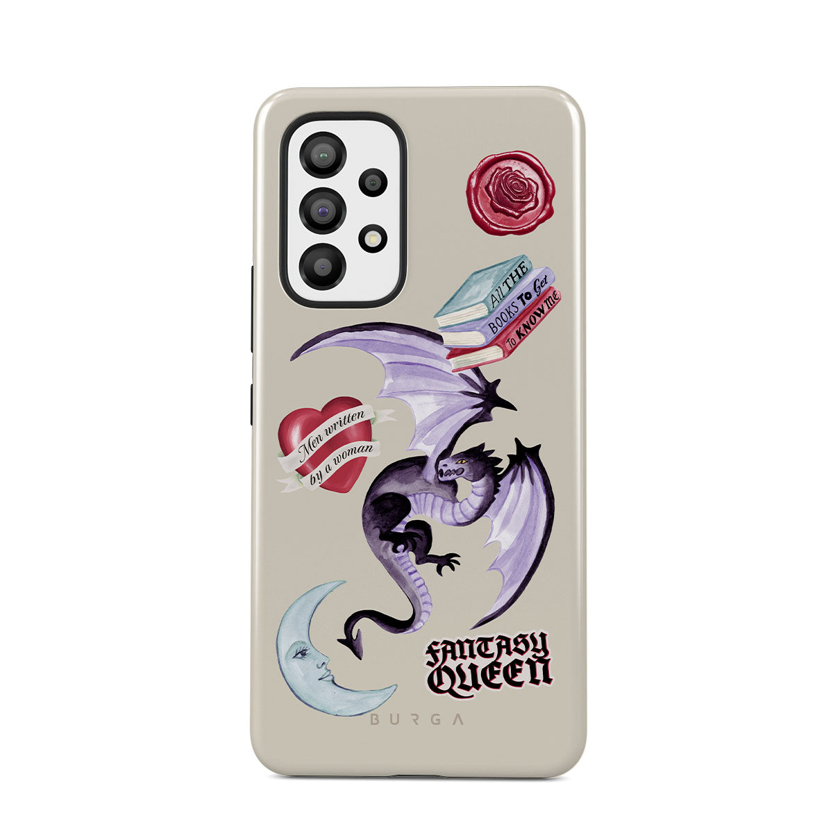 Este design contém: dragão roxo, adesivo "Rainha da Fantasia", lua crescente, lacre de cera roxa, coração com mensagem, livros.