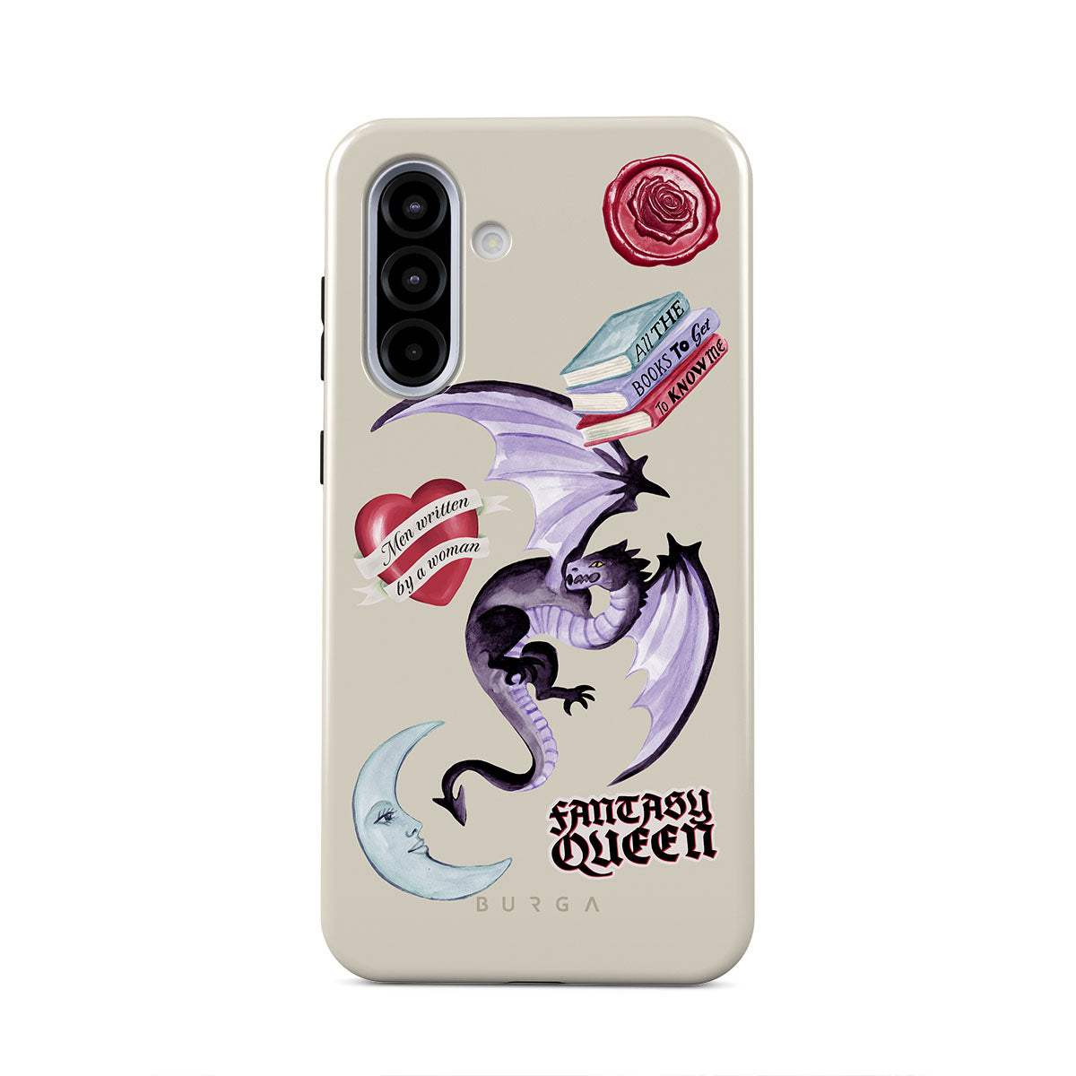 Este design contém: dragão roxo, adesivo "Rainha da Fantasia", lua crescente, lacre de cera roxa, coração com mensagem, livros.