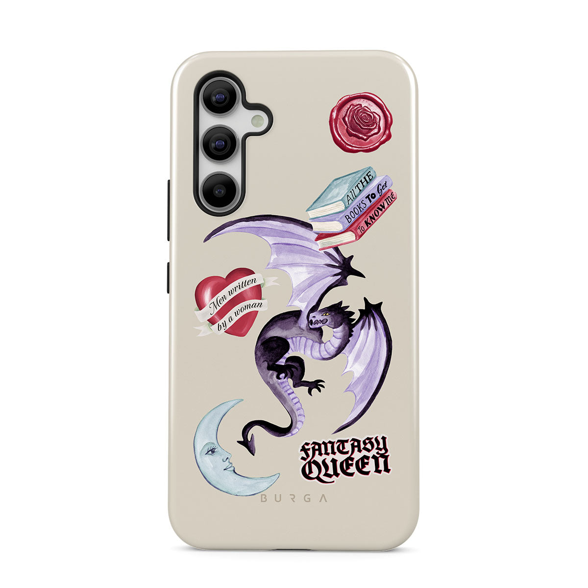 Este design contém: dragão roxo, adesivo "Rainha da Fantasia", lua crescente, lacre de cera roxa, coração com mensagem, livros.