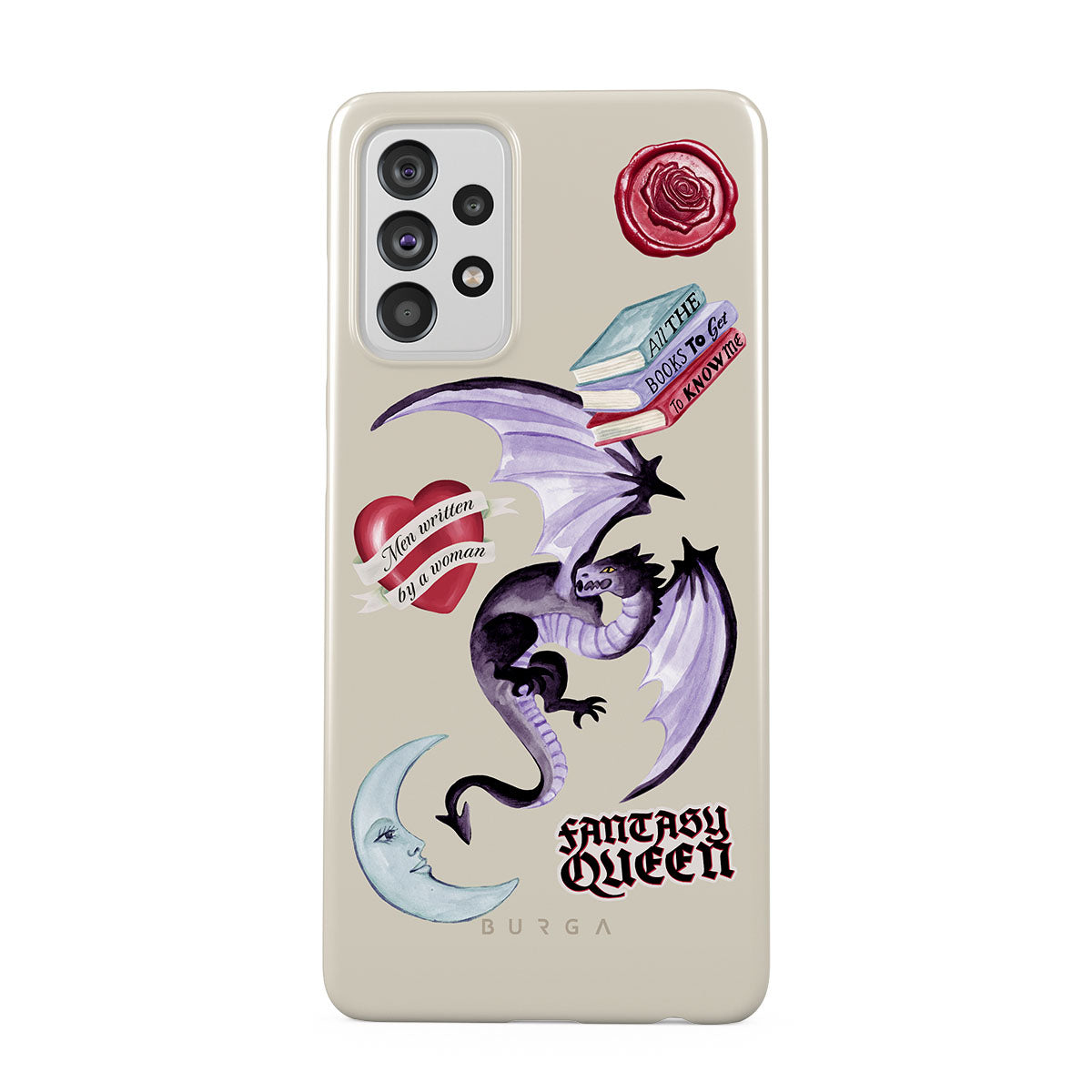 Este design contém: dragão roxo, adesivo "Rainha da Fantasia", lua crescente, lacre de cera roxa, coração com mensagem, livros.