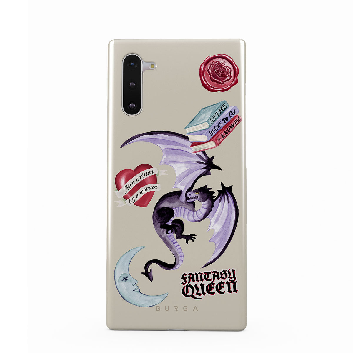 Este design contém: dragão roxo, adesivo "Rainha da Fantasia", lua crescente, lacre de cera roxa, coração com mensagem, livros.