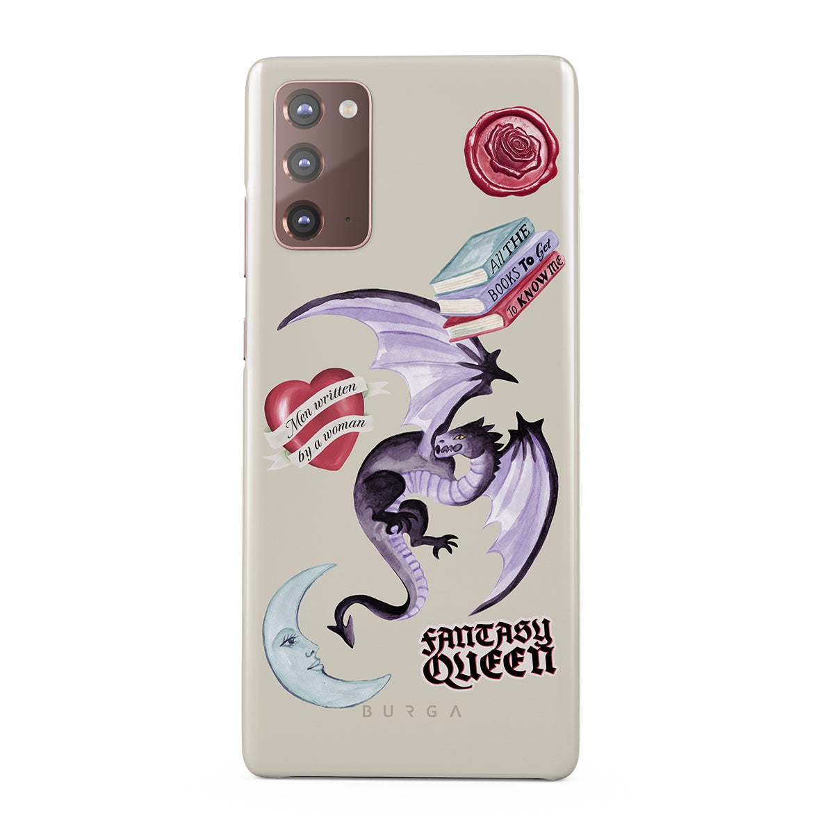 Este design contém: dragão roxo, adesivo "Rainha da Fantasia", lua crescente, lacre de cera roxa, coração com mensagem, livros.