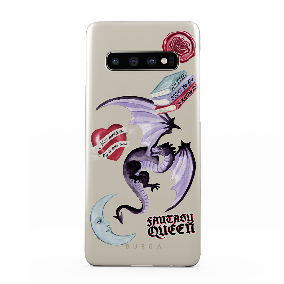 Este design contém: dragão roxo, adesivo "Rainha da Fantasia", lua crescente, lacre de cera roxa, coração com mensagem, livros.