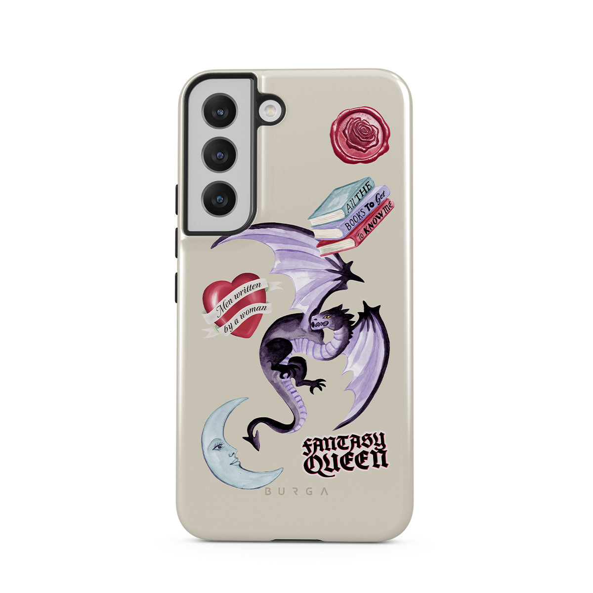 Este design contém: dragão roxo, adesivo "Rainha da Fantasia", lua crescente, lacre de cera roxa, coração com mensagem, livros.