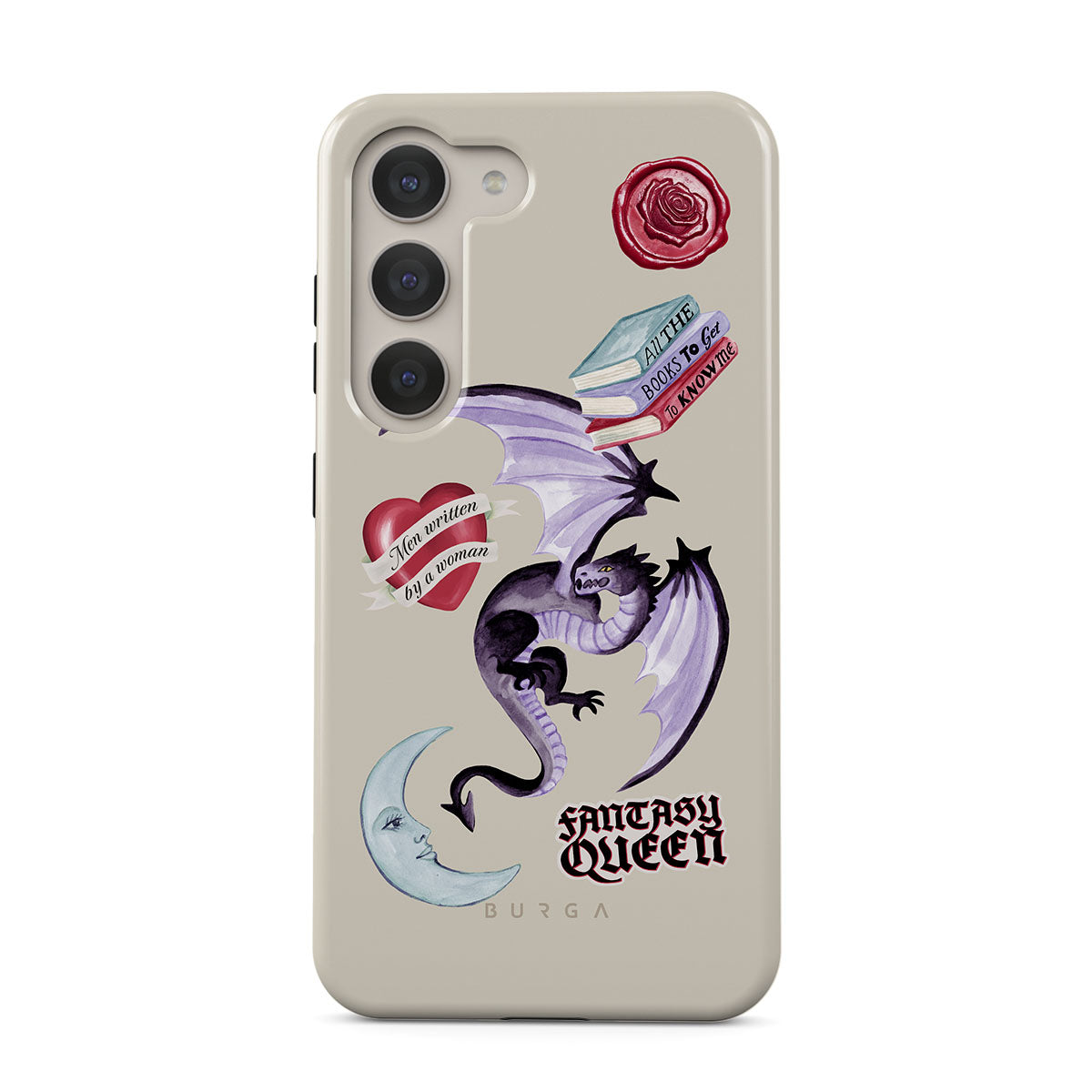 Este design contém: dragão roxo, adesivo "Rainha da Fantasia", lua crescente, lacre de cera roxa, coração com mensagem, livros.
