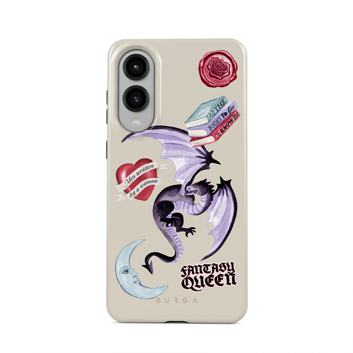 Este design contém: dragão roxo, adesivo "Rainha da Fantasia", lua crescente, lacre de cera roxa, coração com mensagem, livros.