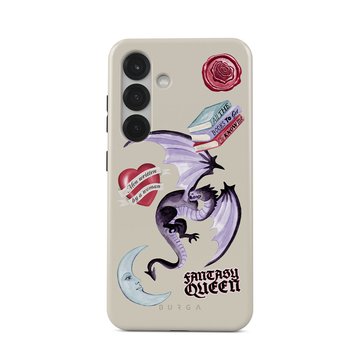 Este design contém: dragão roxo, adesivo "Rainha da Fantasia", lua crescente, lacre de cera roxa, coração com mensagem, livros.