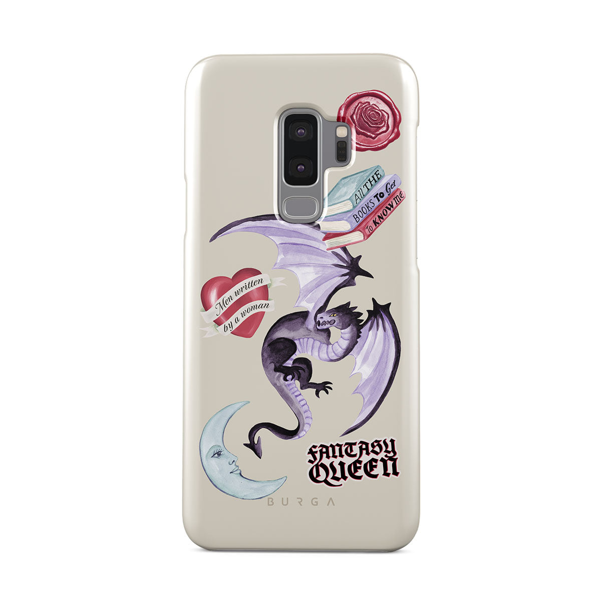 Este design contém: dragão roxo, adesivo "Rainha da Fantasia", lua crescente, lacre de cera roxa, coração com mensagem, livros.