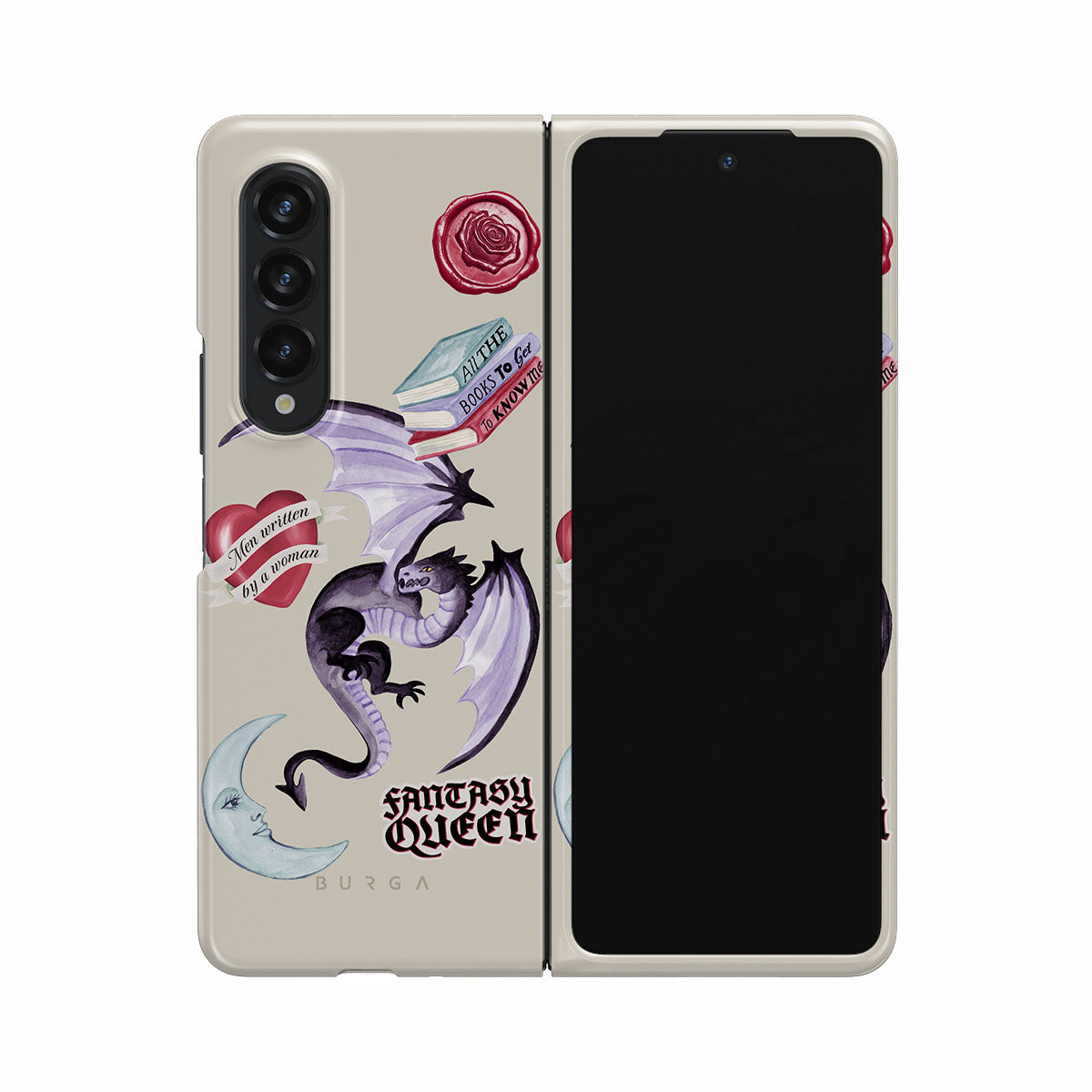 Este design contém: dragão roxo, adesivo "Rainha da Fantasia", lua crescente, lacre de cera roxa, coração com mensagem, livros.