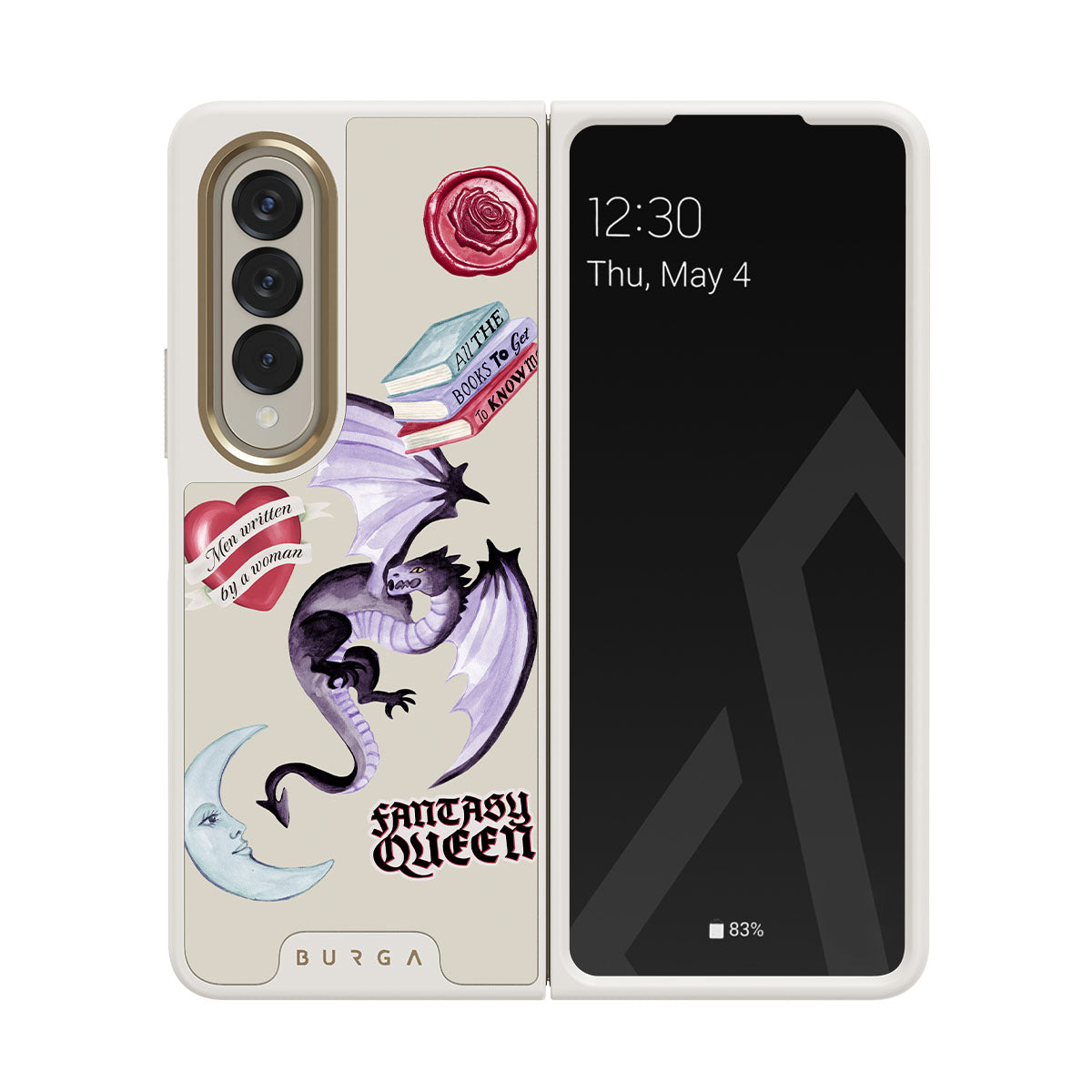 Este design contém: dragão roxo, adesivo "Rainha da Fantasia", lua crescente, lacre de cera roxa, coração com mensagem, livros.