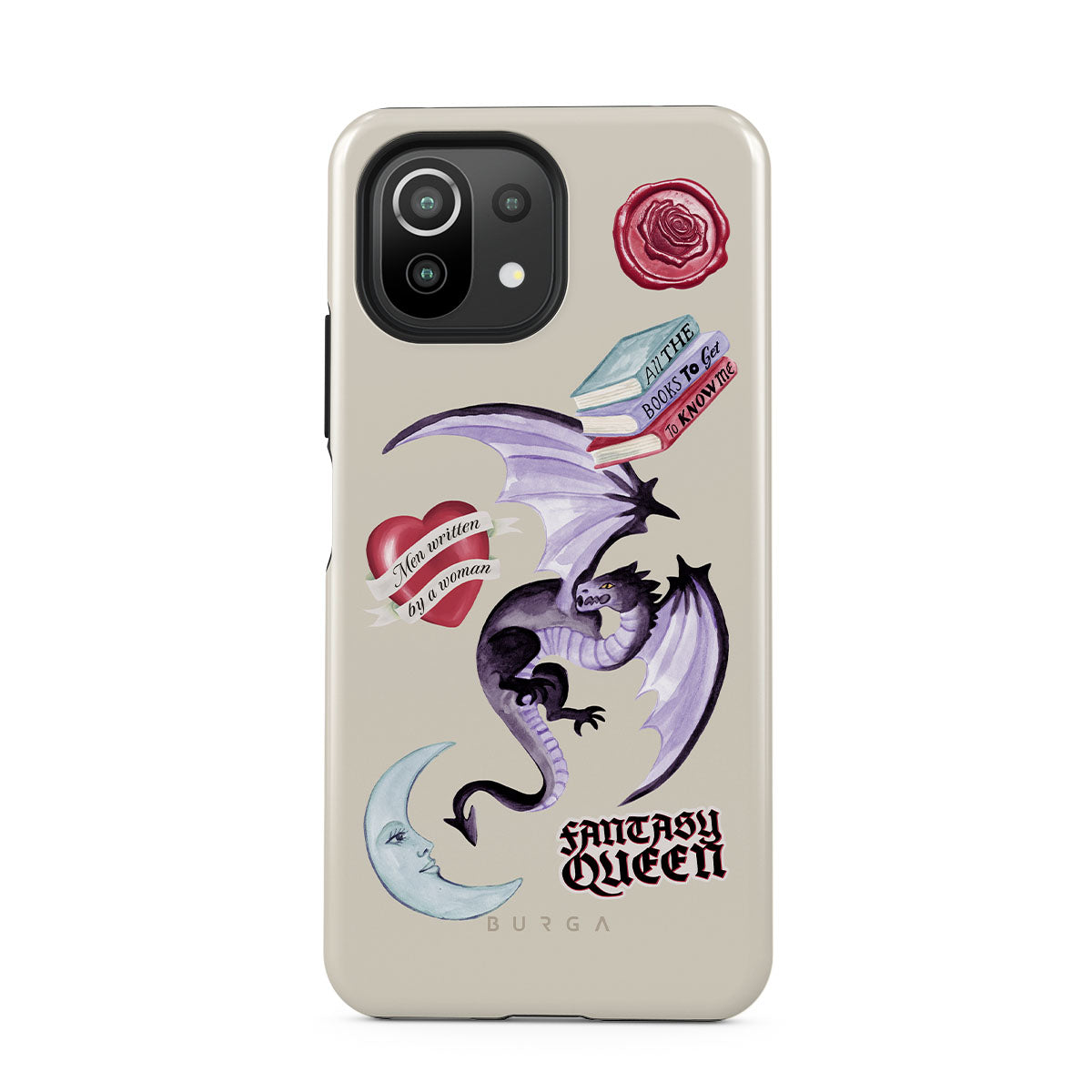 Este design contém: dragão roxo, adesivo "Rainha da Fantasia", lua crescente, lacre de cera roxa, coração com mensagem, livros.