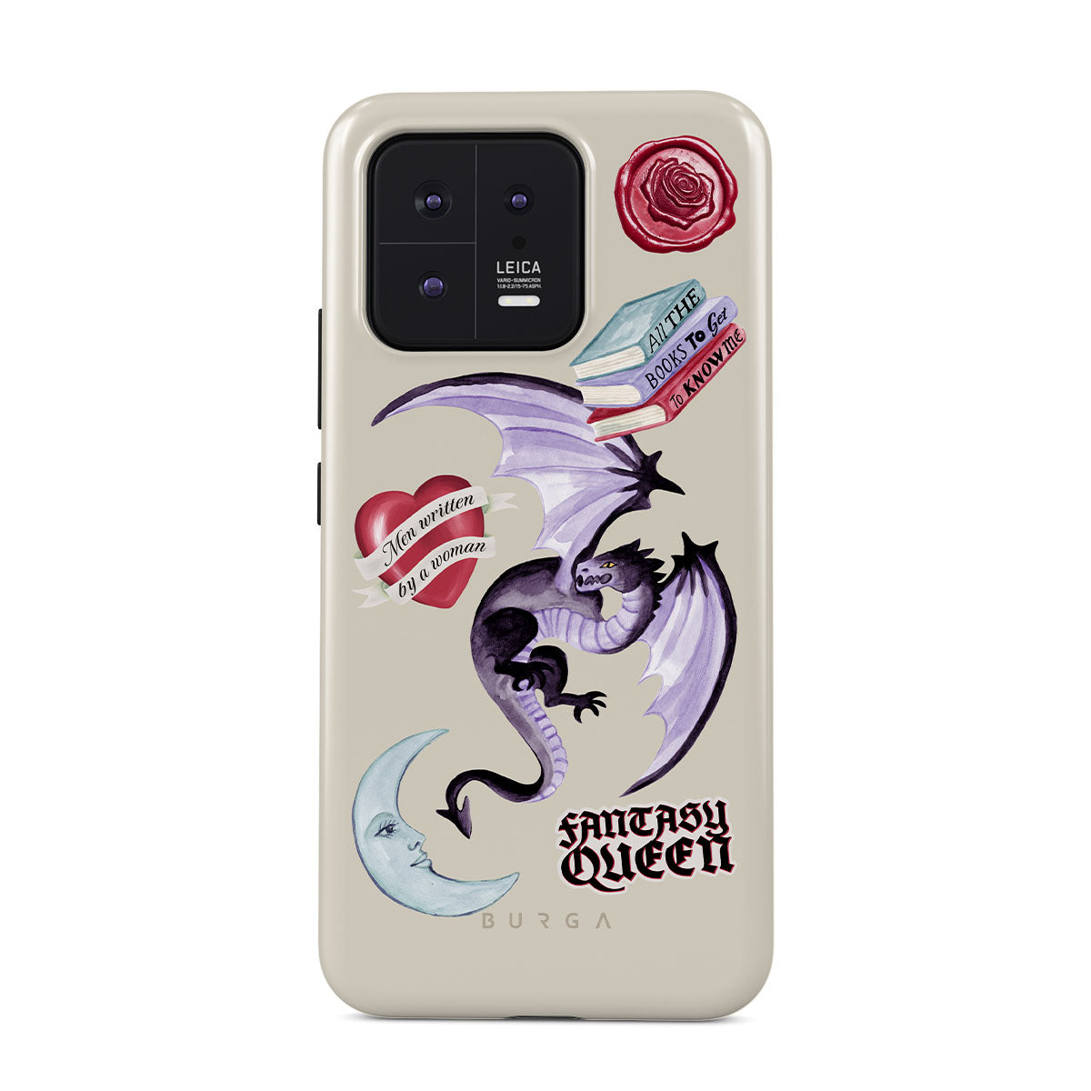 Este design contém: dragão roxo, adesivo "Rainha da Fantasia", lua crescente, lacre de cera roxa, coração com mensagem, livros.