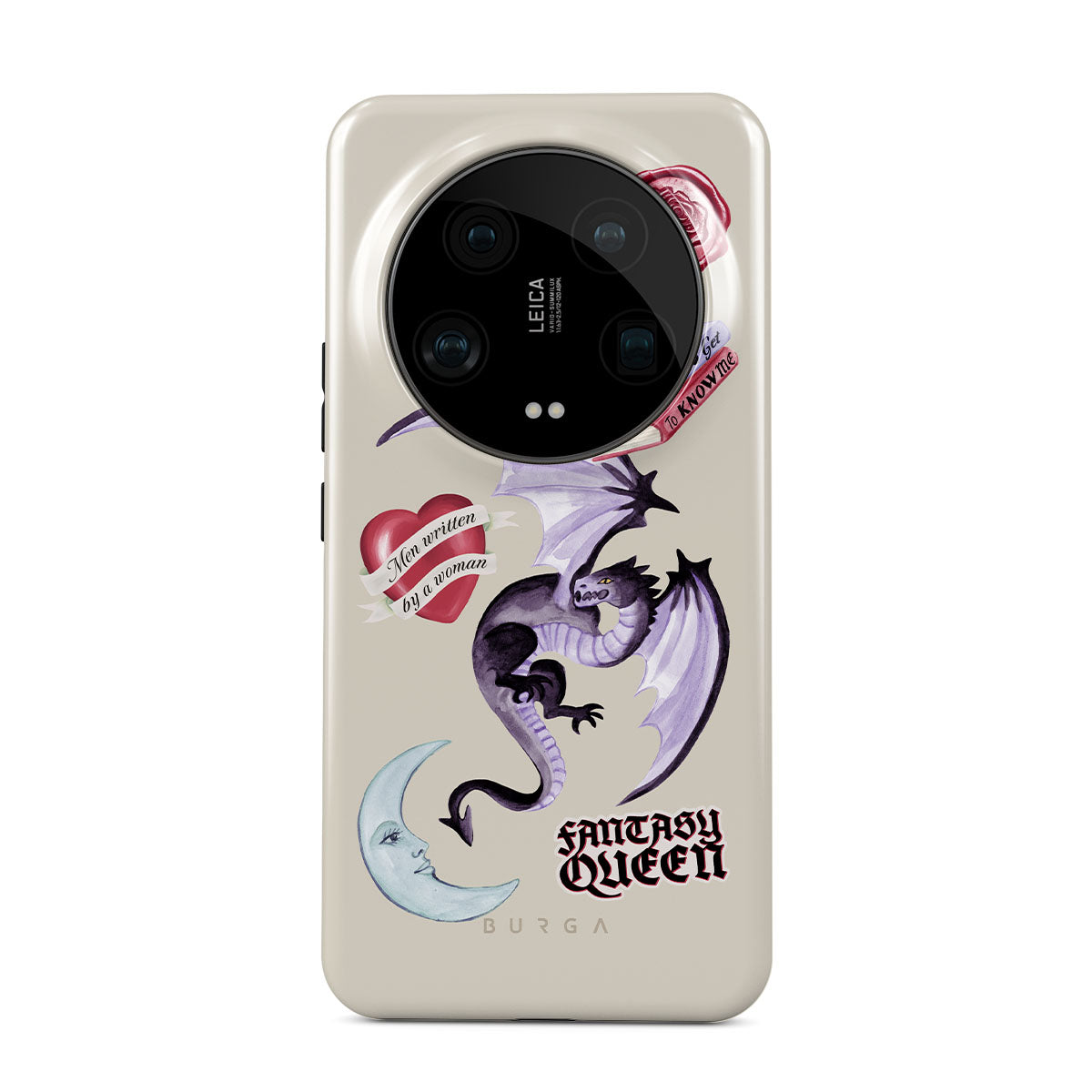 Este design contém: dragão roxo, adesivo "Rainha da Fantasia", lua crescente, lacre de cera roxa, coração com mensagem, livros.