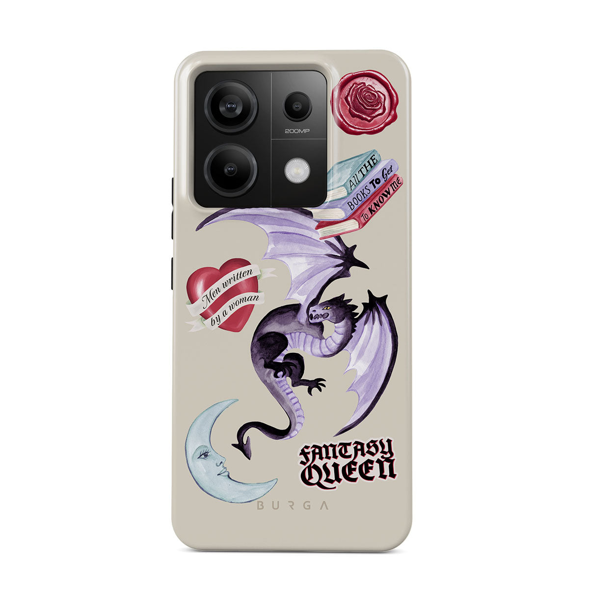 Este design contém: dragão roxo, adesivo "Rainha da Fantasia", lua crescente, lacre de cera roxa, coração com mensagem, livros.