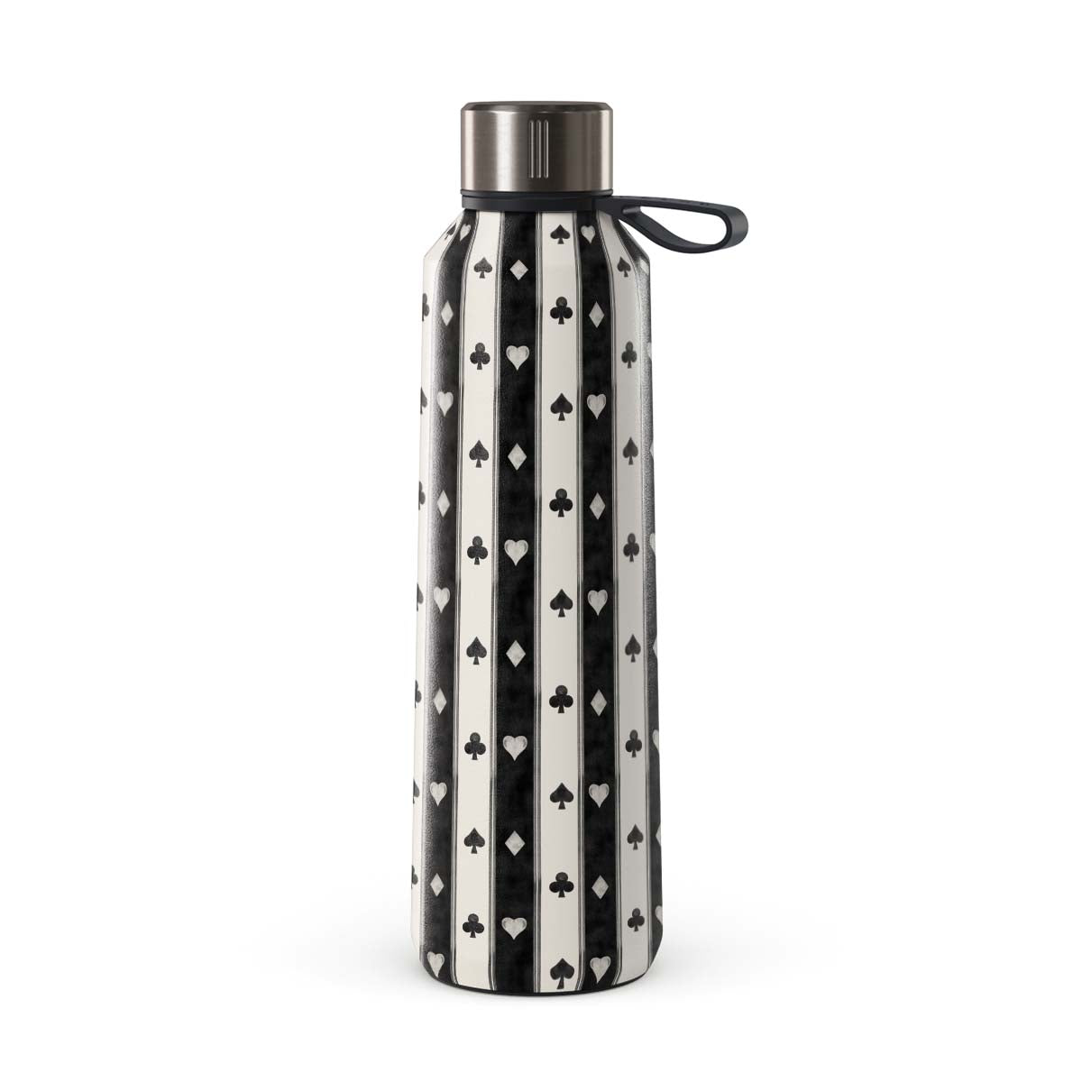 Este design contém: riscas preto e branco, corações, naipes de cartas, estilo vintage