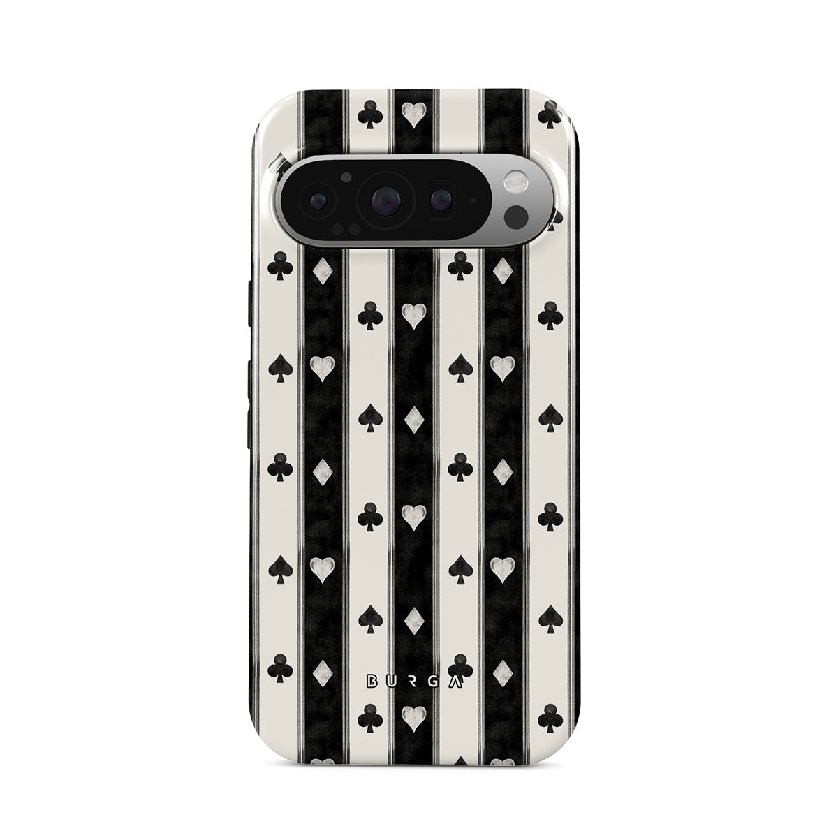 Este design contém: riscas preto e branco, corações, naipes de cartas, estilo vintage