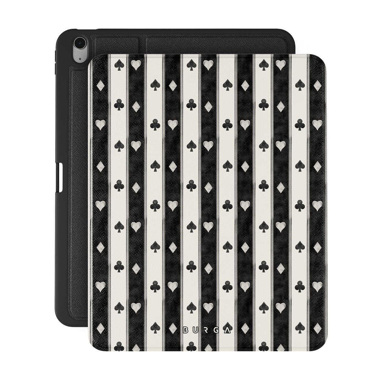 Este design contém: riscas preto e branco, corações, naipes de cartas, estilo vintage