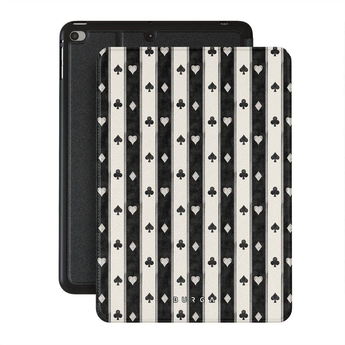 Este design contém: riscas preto e branco, corações, naipes de cartas, estilo vintage