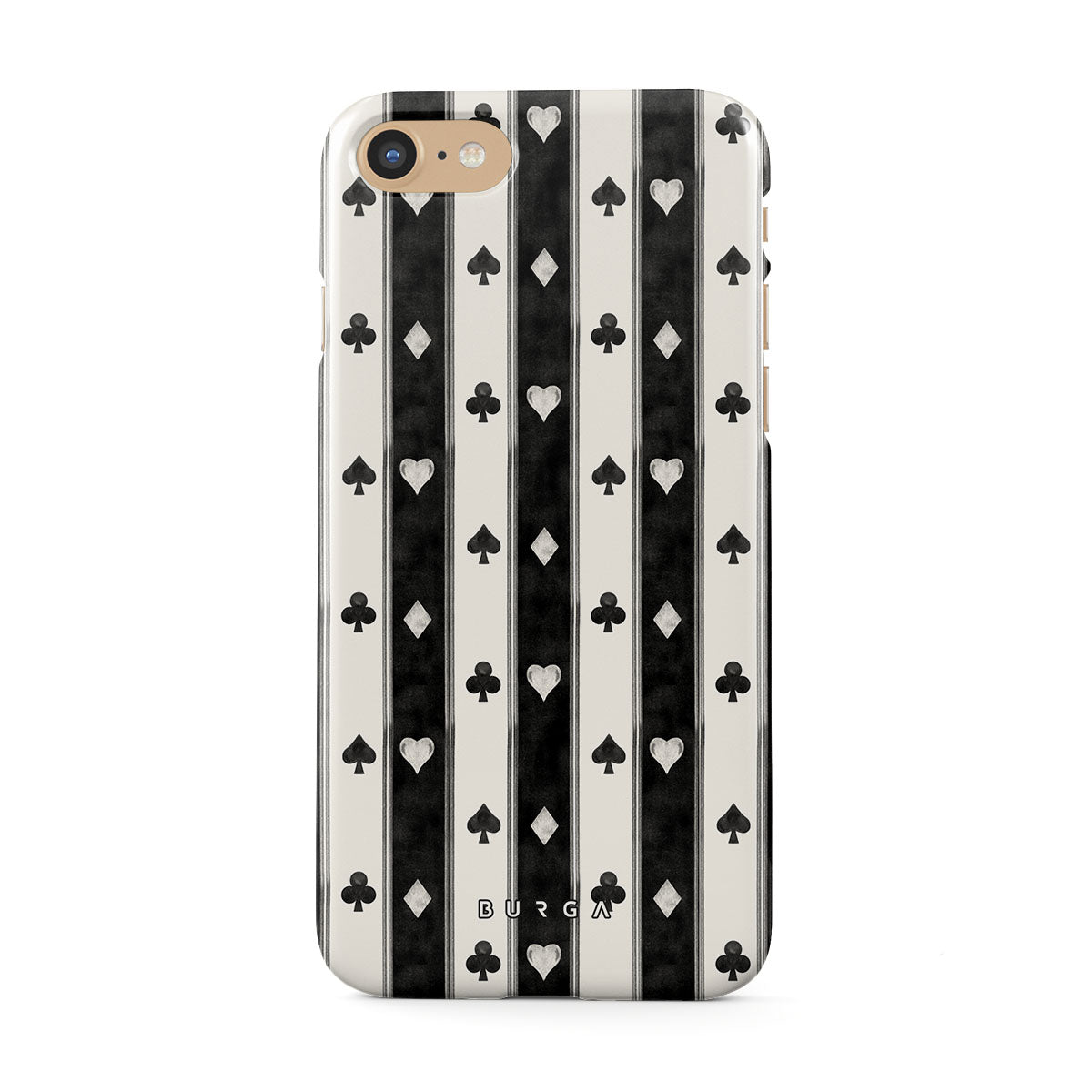 Este design contém: riscas preto e branco, corações, naipes de cartas, estilo vintage