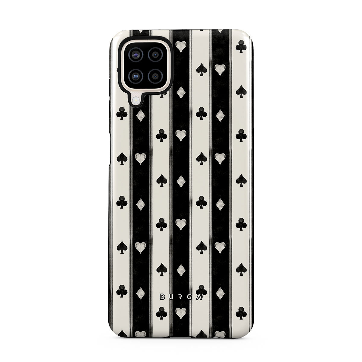 Este design contém: riscas preto e branco, corações, naipes de cartas, estilo vintage