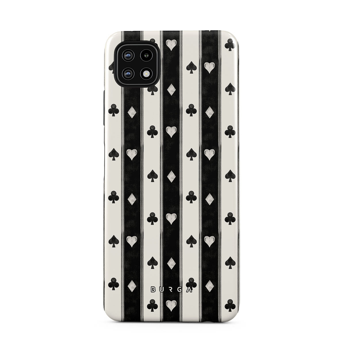Este design contém: riscas preto e branco, corações, naipes de cartas, estilo vintage