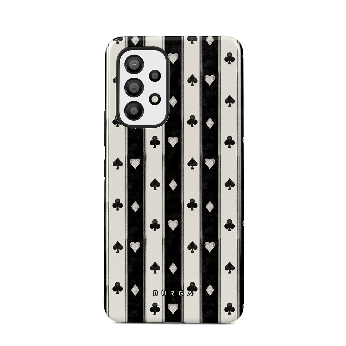 Este design contém: riscas preto e branco, corações, naipes de cartas, estilo vintage
