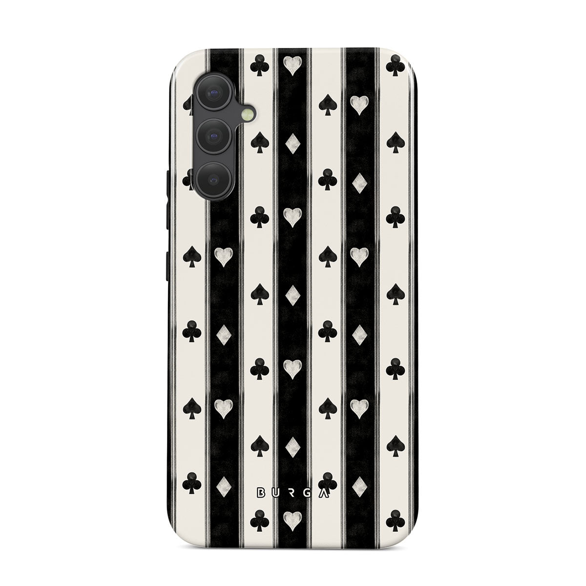 Este design contém: riscas preto e branco, corações, naipes de cartas, estilo vintage