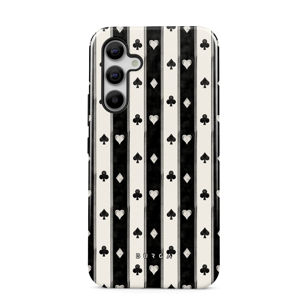 Este design contém: riscas preto e branco, corações, naipes de cartas, estilo vintage