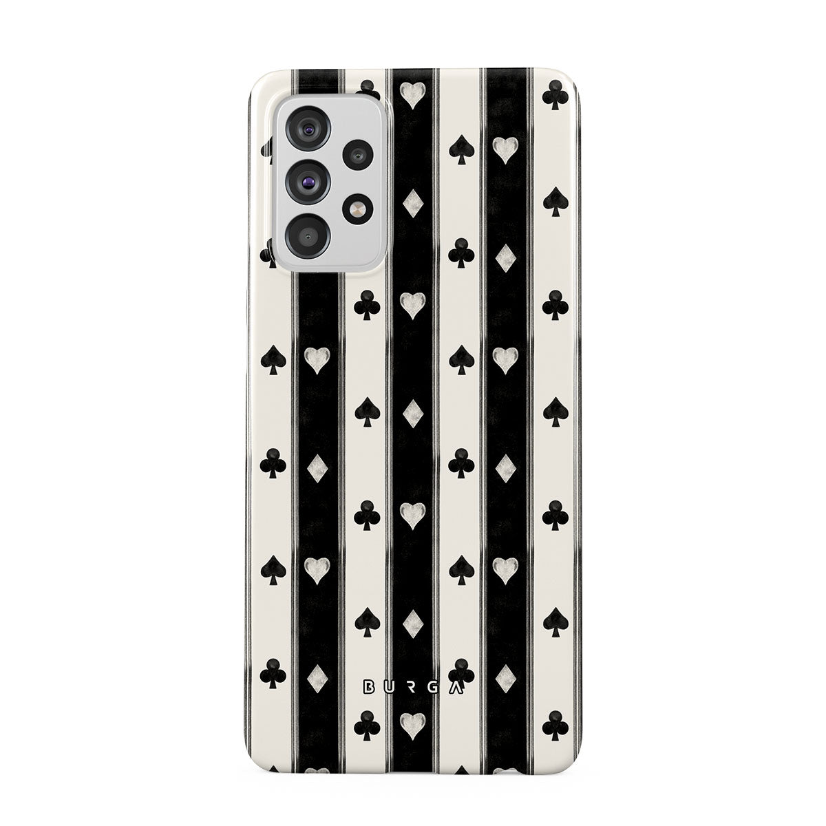 Este design contém: riscas preto e branco, corações, naipes de cartas, estilo vintage