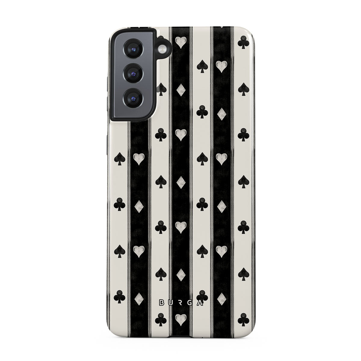 Este design contém: riscas preto e branco, corações, naipes de cartas, estilo vintage