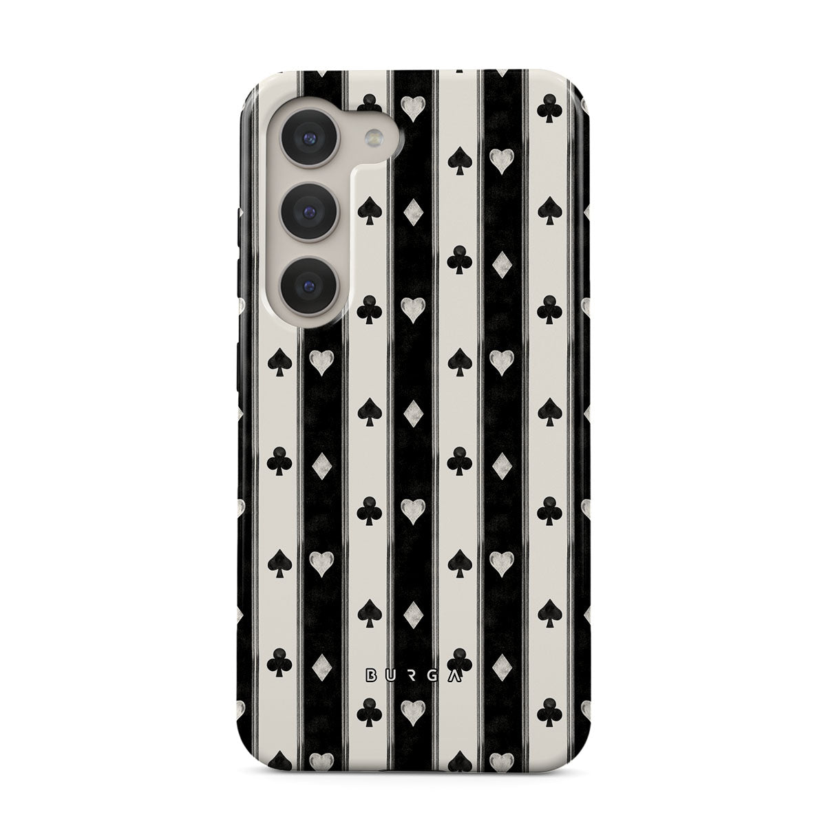 Este design contém: riscas preto e branco, corações, naipes de cartas, estilo vintage