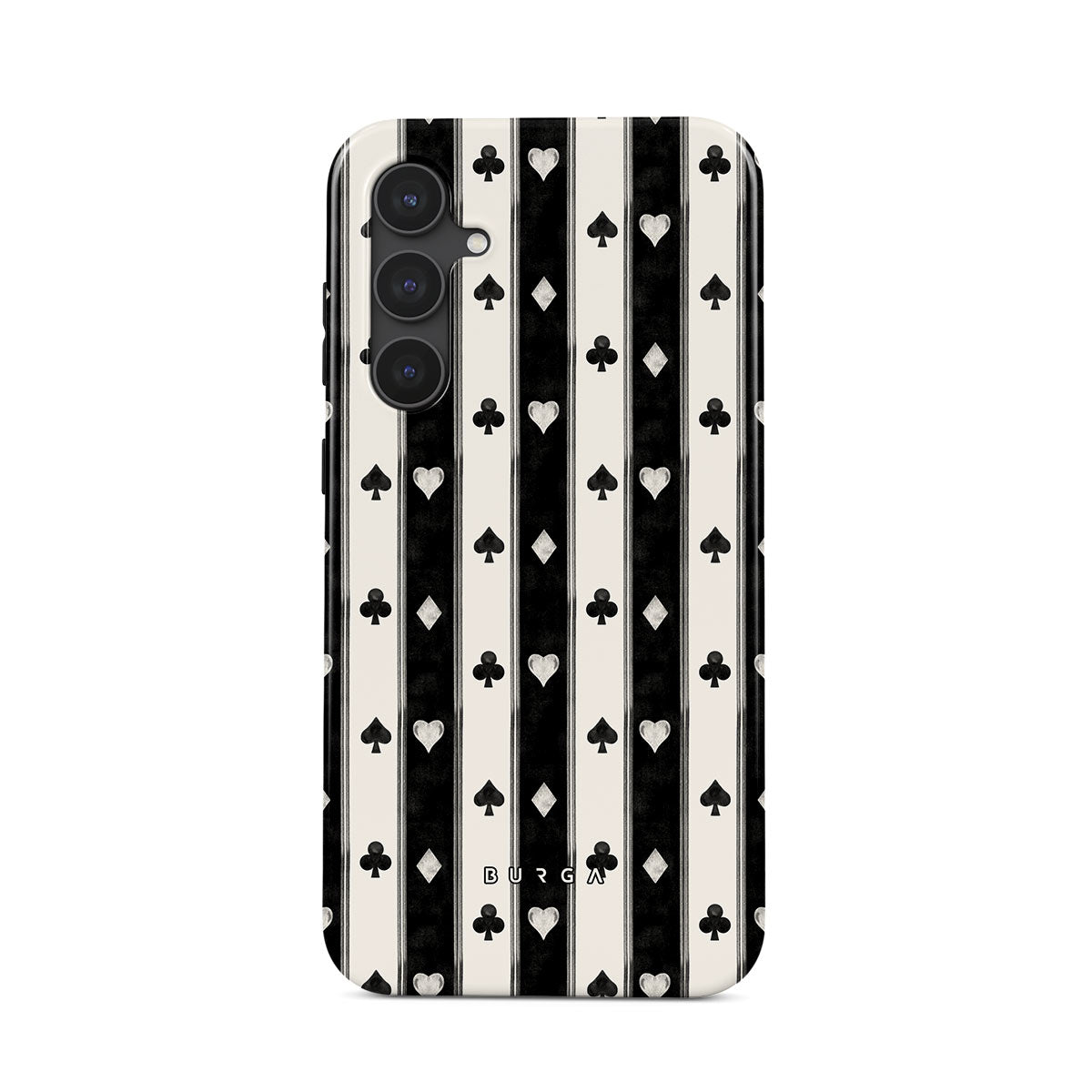 Este design contém: riscas preto e branco, corações, naipes de cartas, estilo vintage