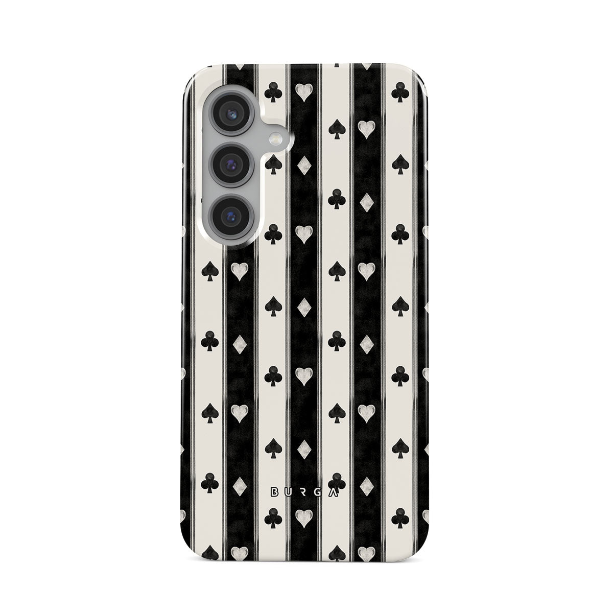 Este design contém: riscas preto e branco, corações, naipes de cartas, estilo vintage