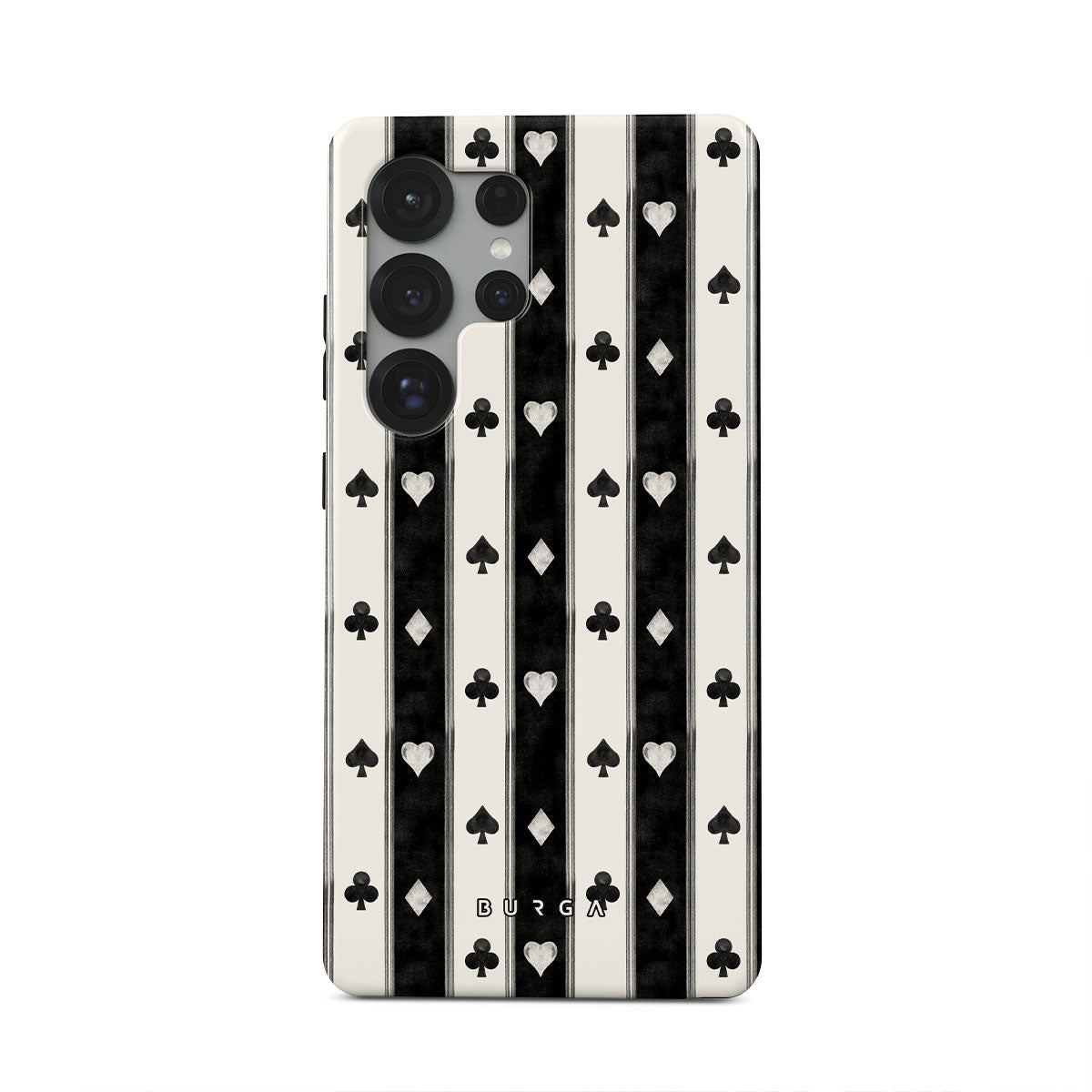 Este design contém: riscas preto e branco, corações, naipes de cartas, estilo vintage